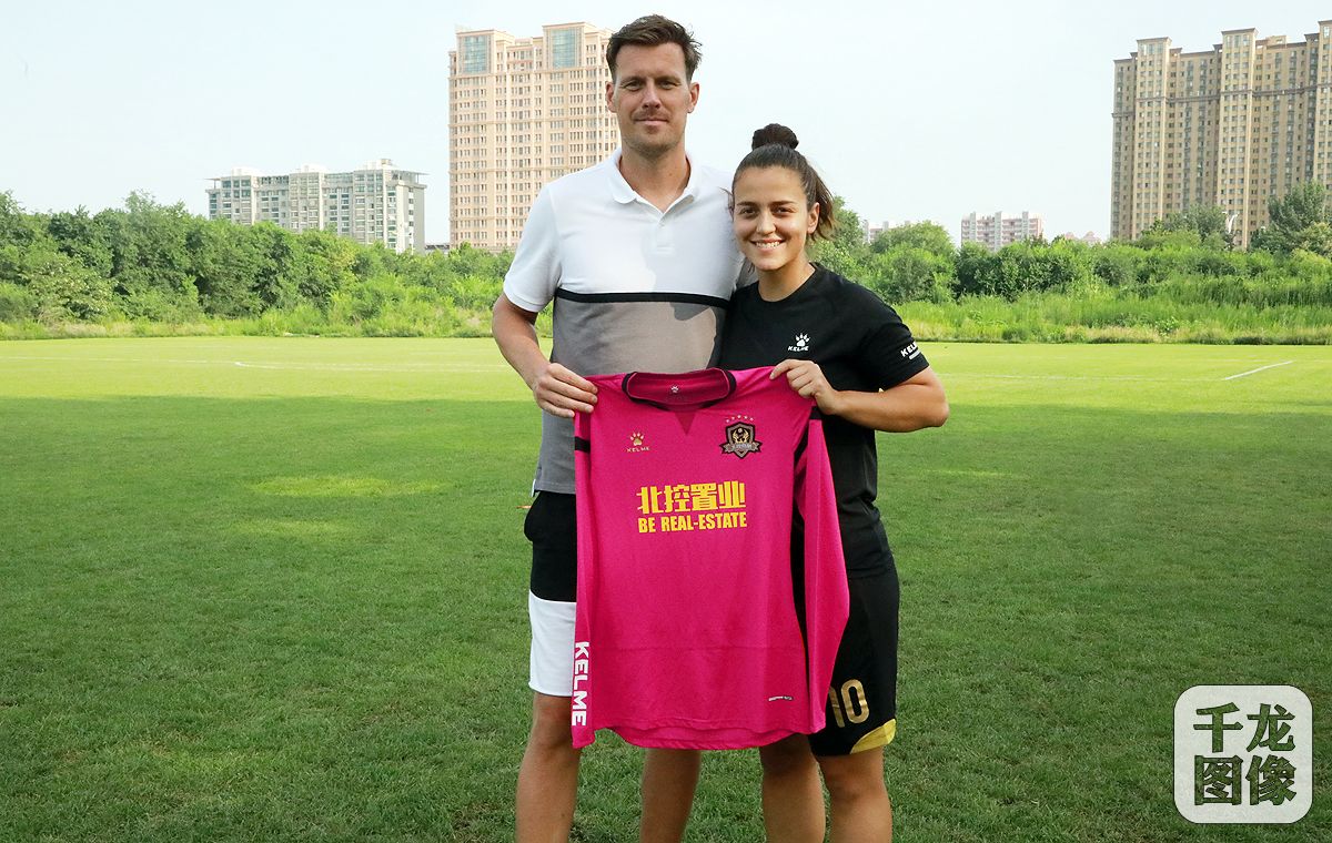 7月10日,北控凤凰足球俱乐部在京宣布,与瑞典国家队主力前锋玛利亚·班努思琪签约,玛利亚·班努思琪将代表北京女足北控置业队出战2018年的中国女足超级联赛。图为玛利亚·班努思琪和主教练凯姆合影。千龙网发 高宇摄