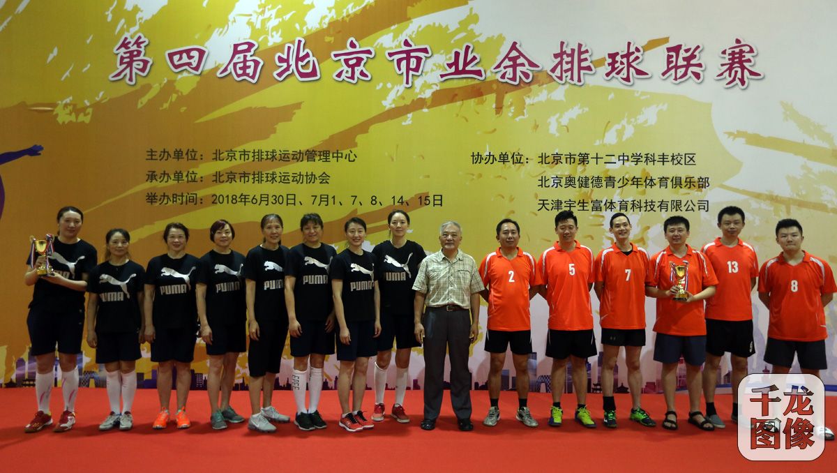 7月15日,第四届北京市业余排球联赛落下帷幕,64支队伍、855人参加比赛,经过6天231场的激烈角逐,决出各个组别的冠亚季军。图为颁奖嘉宾和获奖球队合影。千龙网记者 戚连民摄