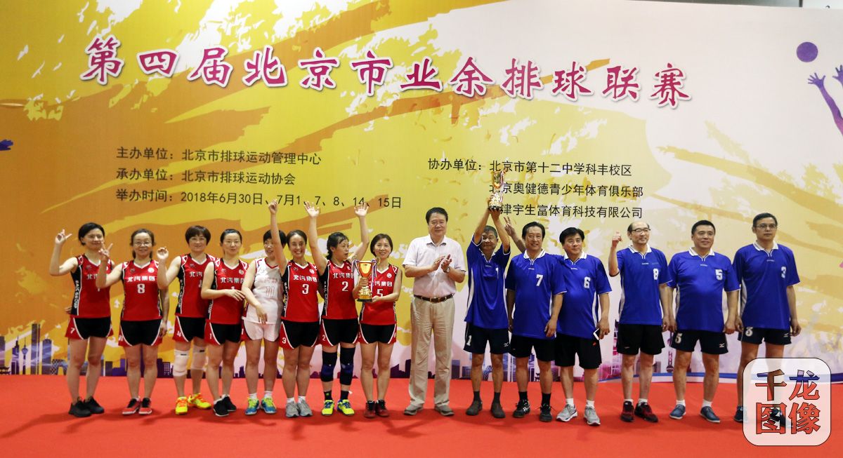 7月15日,第四届北京市业余排球联赛落下帷幕,64支队伍、855人参加比赛,经过6天231场的激烈角逐,决出各个组别的冠亚季军。图为颁奖嘉宾和获奖球队合影。千龙网记者 戚连民摄