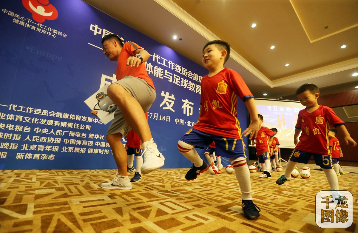7月18日,“中国关心下一代工作委员会健康体育发展中心幼儿体能与足球教育研究院”揭牌仪式在北京国际会议中心举行。图为幼儿园小球员展示足球技艺。千龙网记者 戚连民摄