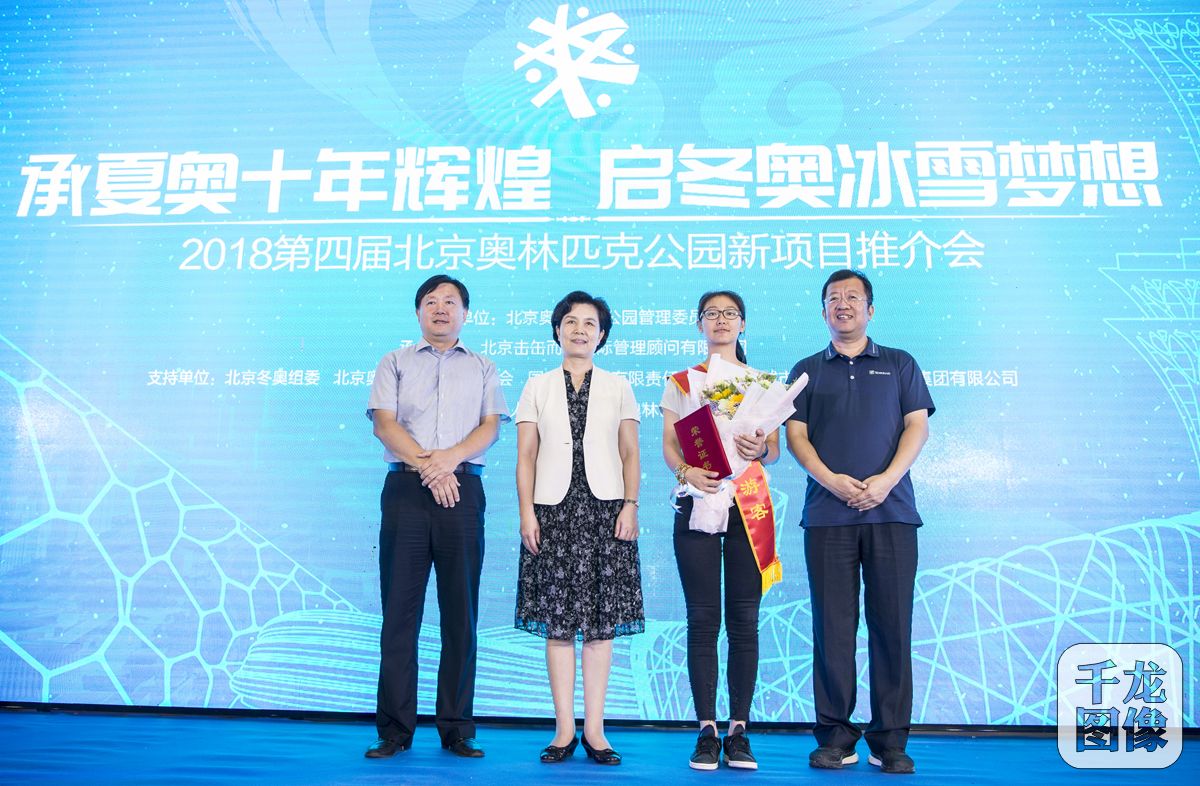 7月26日,以“承夏奥十年辉煌 启冬奥冰雪梦想”为主题的2018年第四届北京奥林匹克公园新项目推介会在鸟巢文化中心零层活动大厅开幕。图为北京市旅游发展委员会党组成员、副主任庹军为第5亿名游客佩戴绶带,北京市朝阳区副区长刘海涛为第5亿名游客赠送鲜花。千龙网发 夏波光摄
