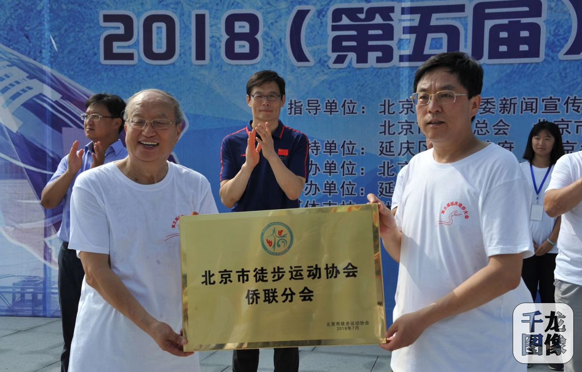 7月31日,“走向2022 为冬奥加油”2018(第五届)延庆徒步大会在延庆妫川广场举行。参加活动2022名徒步爱好者共同为北京筹办2022年冬奥会加油助威。图为北京市徒步运动协会侨联分会正式成立。千龙网发 主办方供图