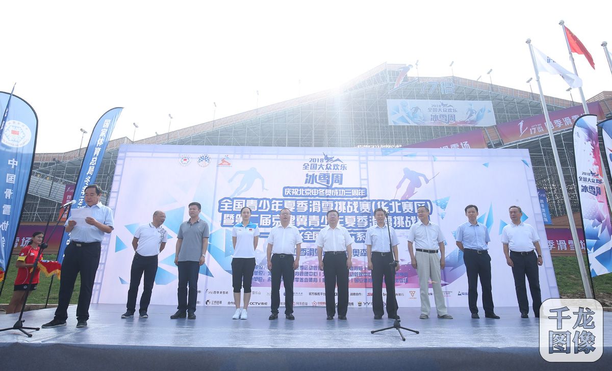 7月31日,第二届京津冀青少年夏季滑雪挑战赛在奥林匹克森林公园北京17滑四季滑雪场举行。图为北京市社会体育管理中心主任曹金亮主持仪式。千龙网发 主办方供图