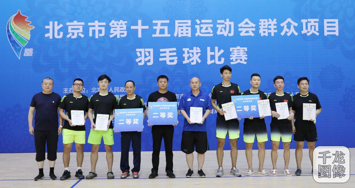 8月3日至5日,北京市第十五届运动会群众项目羽毛球比赛举行,来自北京市15个区和亦庄开发区以及燕山地区的33支代表队,600余名运动员参加比赛。图为北京市房山区体育局局长杨建坡(左一)为获奖选手颁奖。千龙网发 主办方供图