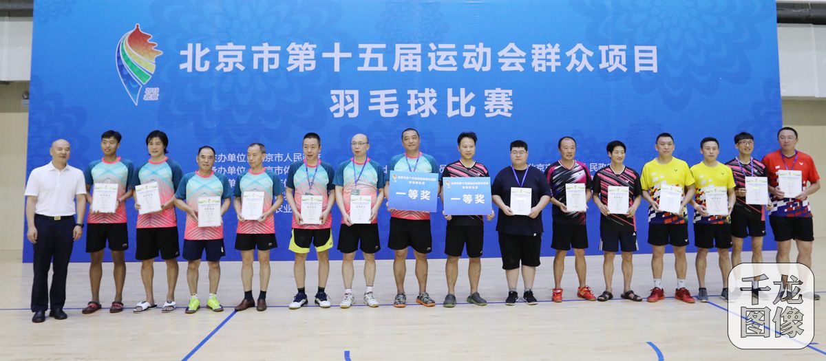 8月3日至5日,北京市第十五届运动会群众项目羽毛球比赛举行,来自北京市15个区和亦庄开发区以及燕山地区的33支代表队,600余名运动员参加比赛。图为北京市第十五届运动会组委会群工部部长、北京市体育局群众体育处处长史江平(左一)为获奖选手颁奖。千龙网发 主办方供图