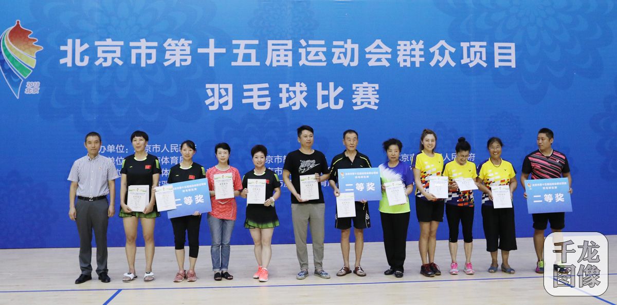 8月3日至5日,北京市第十五届运动会群众项目羽毛球比赛举行,来自北京市15个区和亦庄开发区以及燕山地区的33支代表队,600余名运动员参加比赛。图为北京市体育总会副秘书长张国成(左一)为获奖选手颁奖。千龙网发 主办方供图