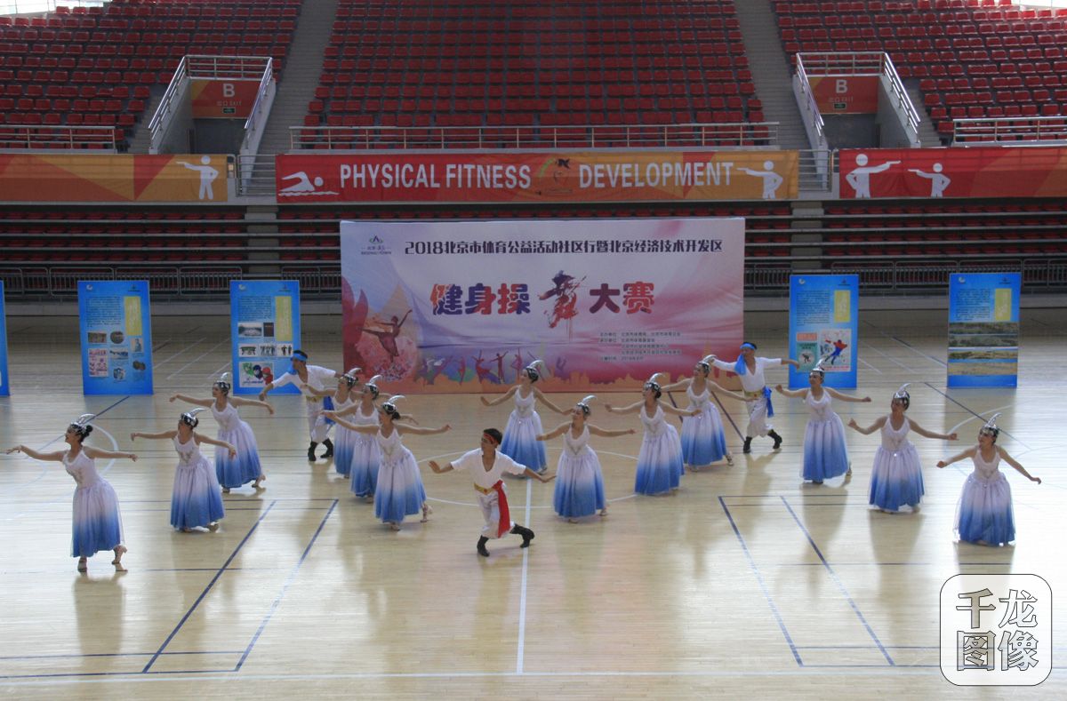 8月3日,“2018北京市体育公益活动社区行暨北京经济技术开发区健身操舞大赛”8月3日在北京电子科技职业技术学院体育馆落幕。图为比赛现场。千龙网发 主办方供图