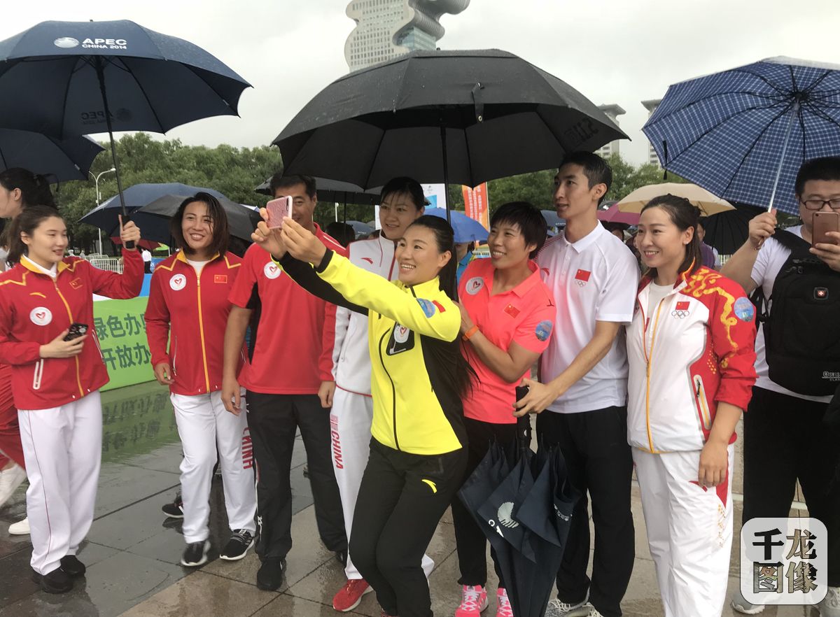 8月8日,2018年全国“全民健身日”活动主会场活动在北京奥林匹克公园庆典广场盛大举行,平昌冬奥会短道速滑500米冠军武大靖宣读全民健身倡议书。图为活动现场“粉丝”和武大靖合影。千龙网记者 戚连民摄