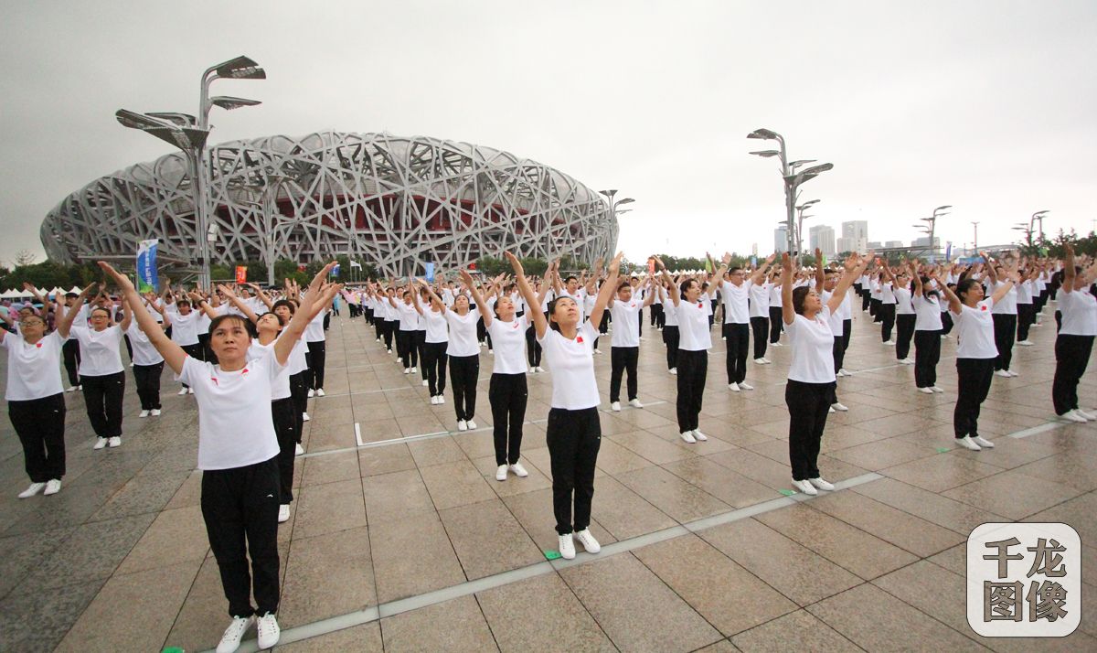 8月8日,2018年全国“全民健身日”活动主会场活动在北京奥林匹克公园庆典广场盛大举行,平昌冬奥会短道速滑500米冠军武大靖宣读全民健身倡议书。图为活动现场广播操展示。千龙网记者 戚连民摄