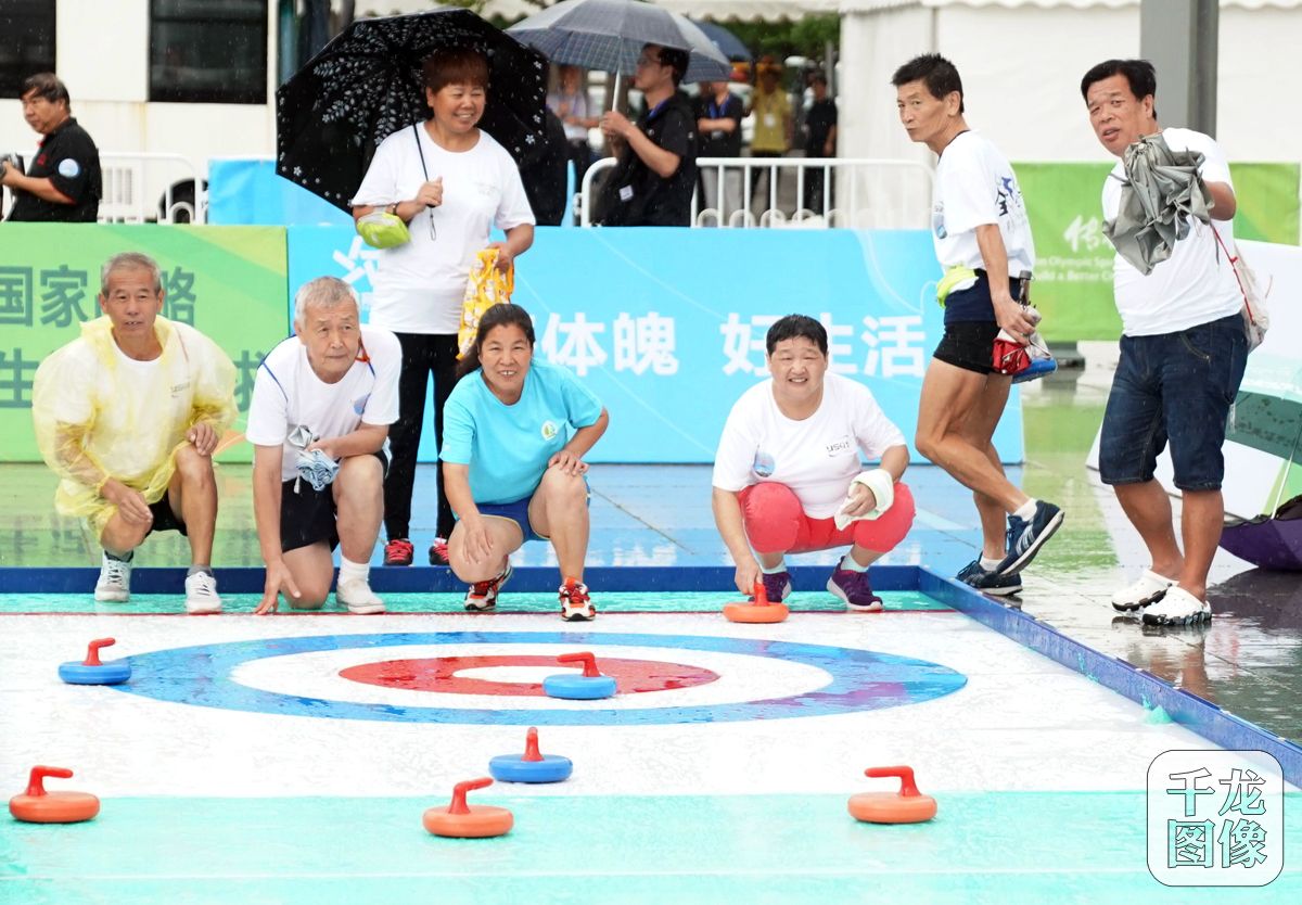 8月8日,2018年全国“全民健身日”活动主会场活动在北京奥林匹克公园庆典广场盛大举行,平昌冬奥会短道速滑500米冠军武大靖宣读全民健身倡议书。图为活动现场旱地冰壶展示。千龙网记者 戚连民摄
