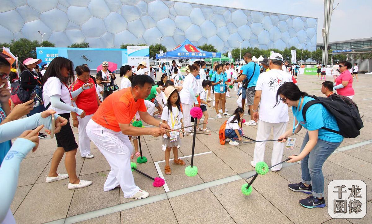 8月10日,第九届北京奥运城市体育文化节“国际交流日-北京欢迎你”项目在奥林匹克公园举行,来自十多个国家1500余名不同肤色的国际青少年参加活动。图为中外青少年在老师的指导下体验打花棍。千龙网发 主办方供图