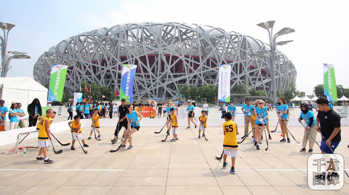8月10日,第九届北京奥运城市体育文化节“国际交流日-北京欢迎你”项目在奥林匹克公园举行,来自十多个国家1500余名不同肤色的国际青少年参加活动。图为中外青少年体验旱地冰球。千龙网发 主办方供图