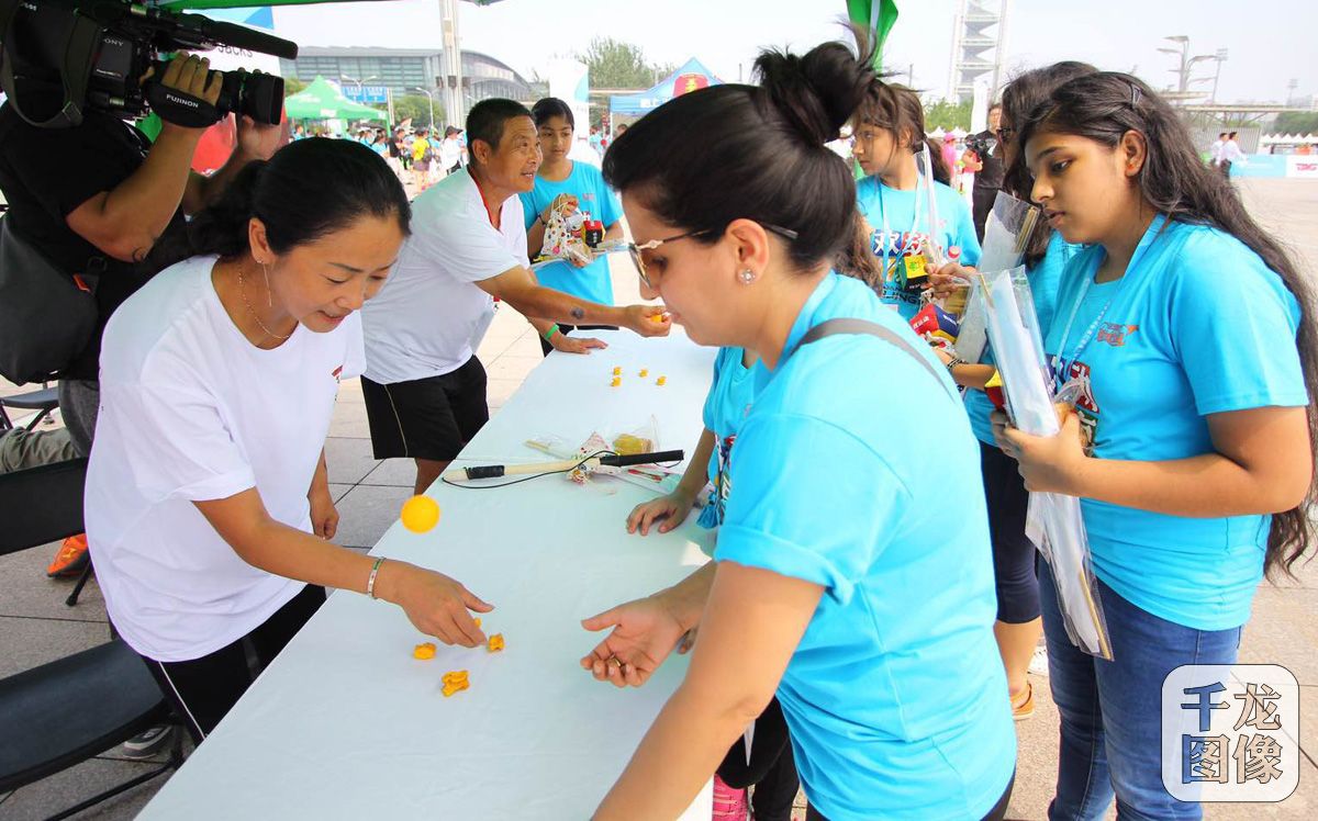8月10日,第九届北京奥运城市体育文化节“国际交流日-北京欢迎你”项目在奥林匹克公园举行,来自十多个国家1500余名不同肤色的国际青少年参加活动。图为中外青少年体验抓羊拐。千龙网发 主办方供图