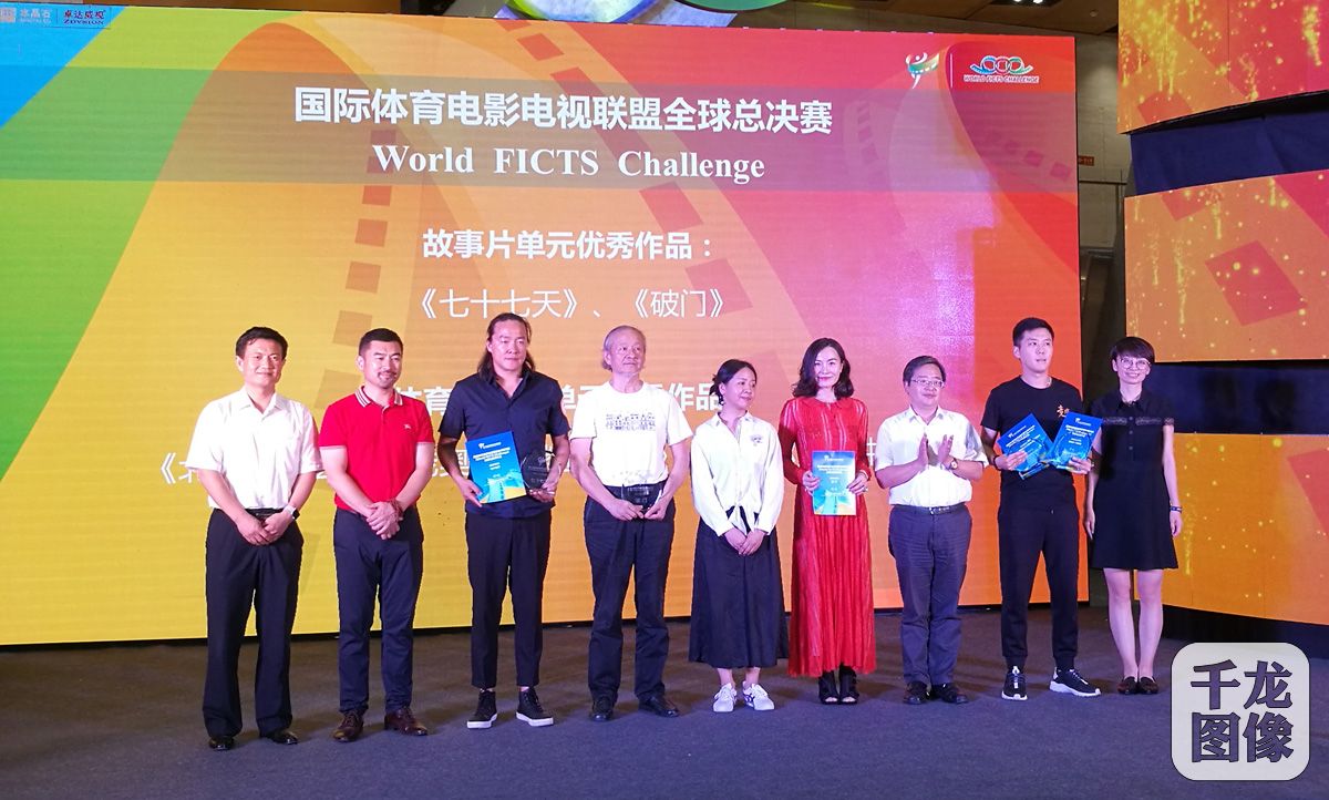 8月13日,第十四届北京国际体育电影周闭幕式及颁奖典礼在鸟巢文化中心举行,50部跑步题材影视作品荣获传媒荣誉奖,21部体育影片荣获米兰国际体育电影电视节全球总决赛北京站优秀作品奖,并将代表中国参加被誉为“全球体育电影奥斯卡”的米兰国际体育电影电视节总决赛。图为北京市体育局副巡视员卢宏泽(左一)为获奖者颁奖。千龙网记者 戚连民摄