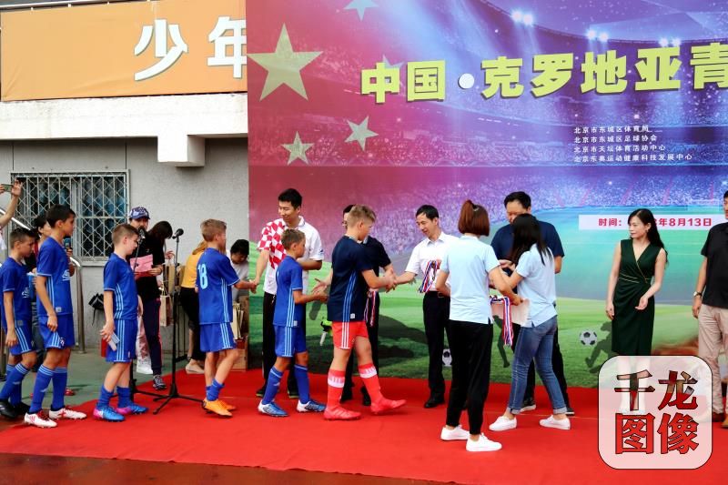 8月13日,中国-克罗地亚青少年足球友谊赛在天坛体育活动中心举行,东城U12足球代表队1:0战胜克罗地亚萨格勒布迪纳摩俱乐部U12代表队。图为与会领导和嘉宾为小球员颁奖。千龙网发 主办方供图