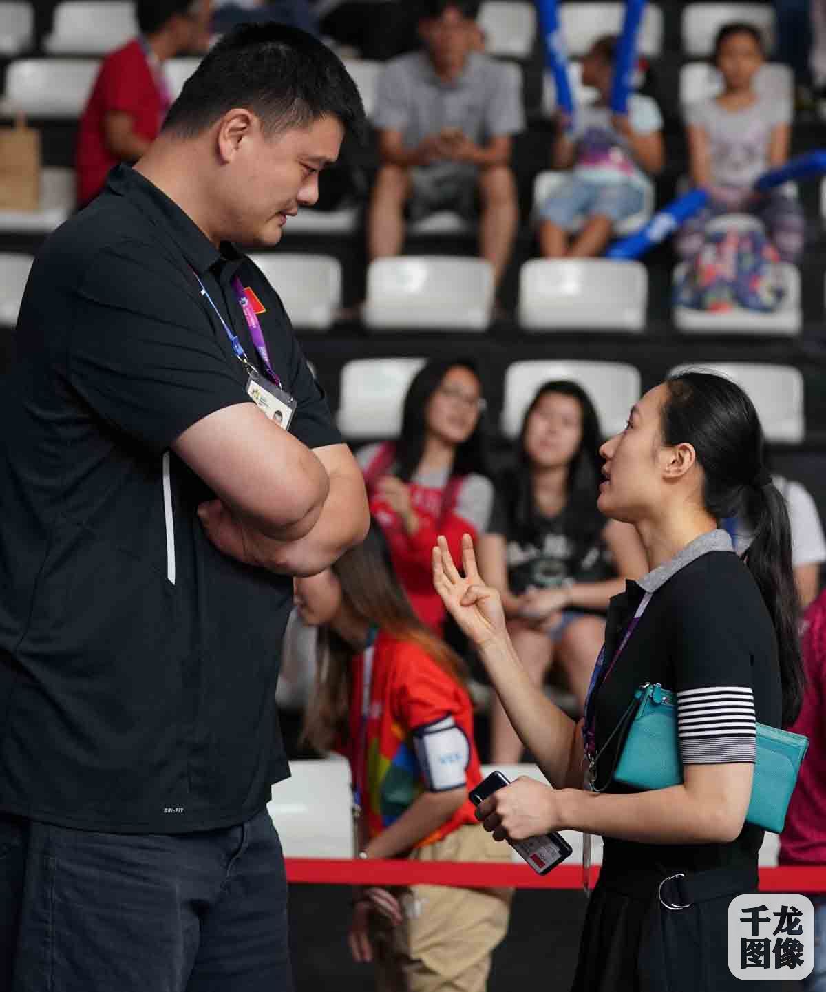 8月17日,在亚运会女篮小组赛的焦点战中,中国队105比73 战胜强敌日本队,结束了对日本队的六连败,大涨士气。图为篮协主席姚明现场督战、冬奥会冠军张虹也到场边观战。千龙网发 特约摄影 萧峰 摄