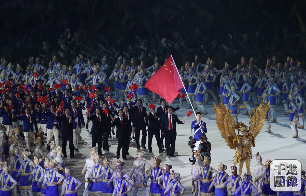 8月18日,2018年印尼雅加达亚运会开幕式在朋加诺体育场举行。在圣火点燃时刻,印尼羽毛球名宿王莲香走上山脉。当她点燃圣火的一刻,“岩浆”倾泻而下,将开幕式气氛推向高潮。图为开幕式中国代表团步入体育场。千龙网发 萧峰摄