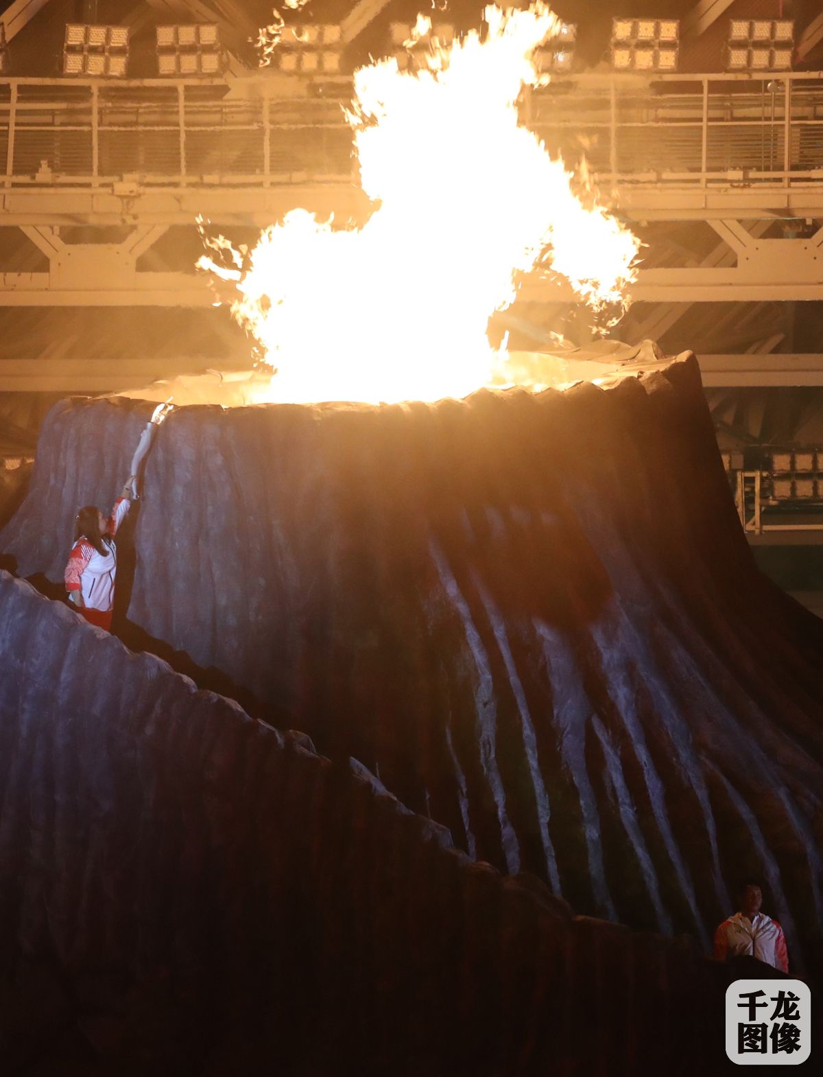 8月18日,2018年印尼雅加达亚运会开幕式在朋加诺体育场举行。在圣火点燃时刻,印尼羽毛球名宿王莲香走上山脉。当她点燃圣火的一刻,“岩浆”倾泻而下,将开幕式气氛推向高潮。图为开幕式现场精彩瞬间。千龙网发 萧峰摄