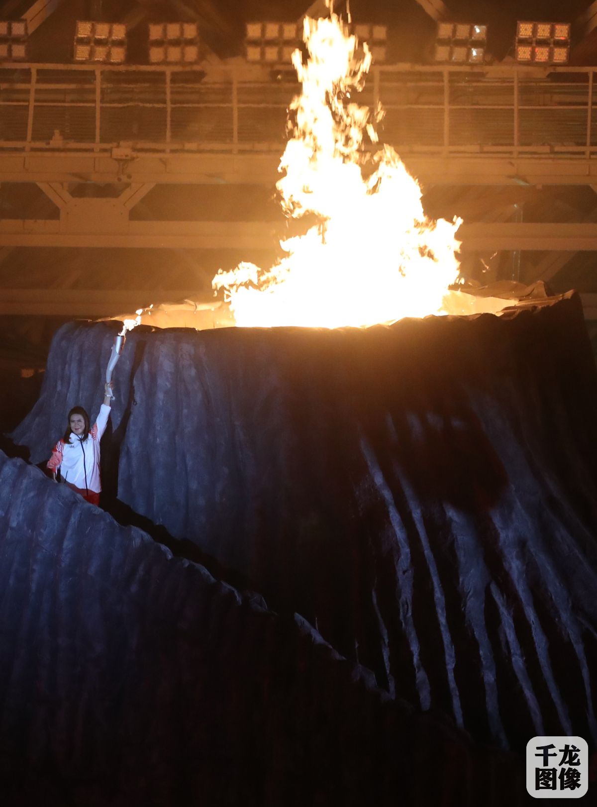 8月18日,2018年印尼雅加达亚运会开幕式在朋加诺体育场举行。在圣火点燃时刻,印尼羽毛球名宿王莲香走上山脉。当她点燃圣火的一刻,“岩浆”倾泻而下,将开幕式气氛推向高潮。图为开幕式现场精彩瞬间。千龙网发 萧峰摄