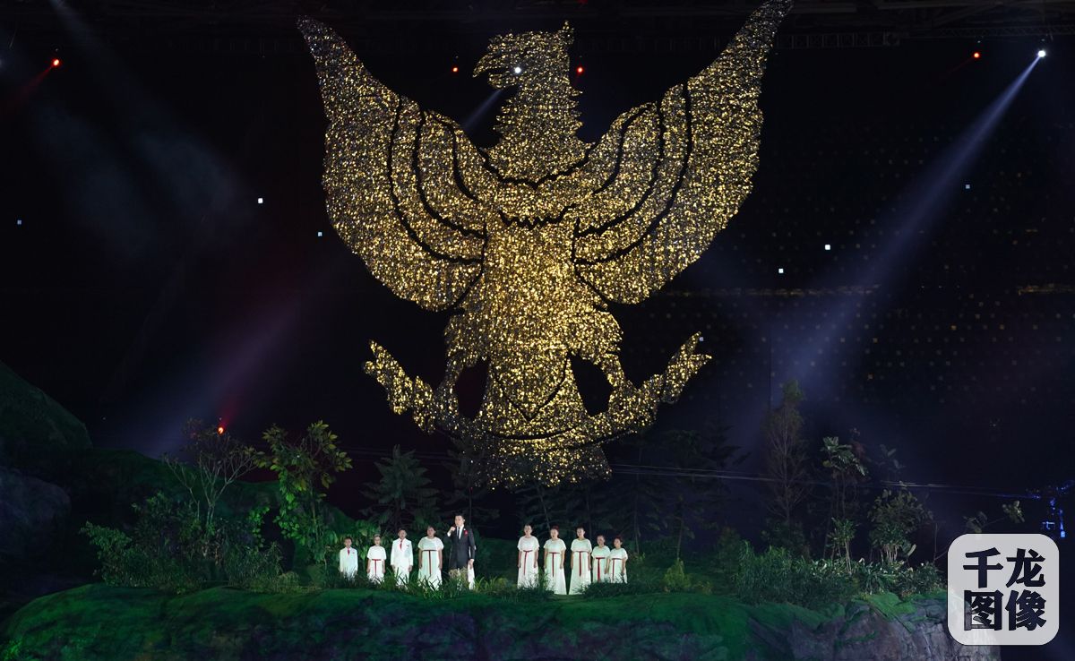 8月18日,2018年印尼雅加达亚运会开幕式在朋加诺体育场举行。在圣火点燃时刻,印尼羽毛球名宿王莲香走上山脉。当她点燃圣火的一刻,“岩浆”倾泻而下,将开幕式气氛推向高潮。图为开幕式现场精彩瞬间。千龙网发 萧峰摄