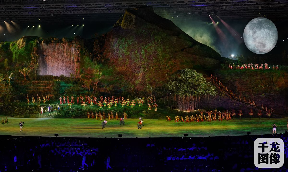 8月18日,2018年印尼雅加达亚运会开幕式在朋加诺体育场举行。在圣火点燃时刻,印尼羽毛球名宿王莲香走上山脉。当她点燃圣火的一刻,“岩浆”倾泻而下,将开幕式气氛推向高潮。图为开幕式现场精彩瞬间。千龙网发 萧峰摄