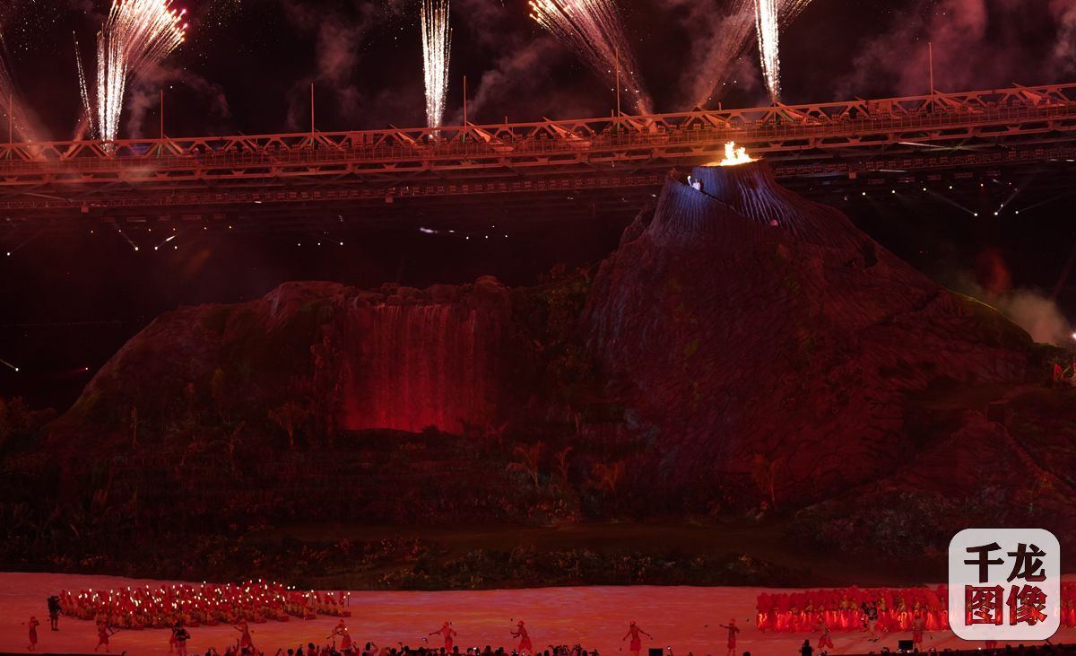 8月18日,2018年印尼雅加达亚运会开幕式在朋加诺体育场举行。在圣火点燃时刻,印尼羽毛球名宿王莲香走上山脉。当她点燃圣火的一刻,“岩浆”倾泻而下,将开幕式气氛推向高潮。图为开幕式现场精彩瞬间。千龙网发 萧峰摄