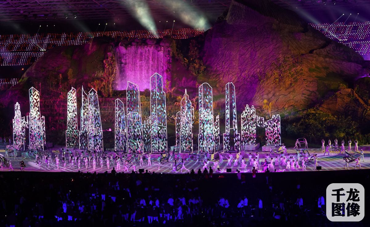 8月18日,2018年印尼雅加达亚运会开幕式在朋加诺体育场举行。在圣火点燃时刻,印尼羽毛球名宿王莲香走上山脉。当她点燃圣火的一刻,“岩浆”倾泻而下,将开幕式气氛推向高潮。图为开幕式现场精彩瞬间。千龙网发 萧峰摄