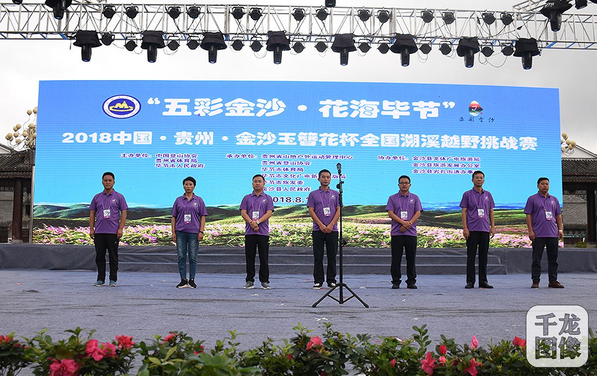 8月18日,“花海毕节·五彩金沙”2018中国·贵州·金沙玉簪花杯全国溯溪越野挑战赛鸣枪,来自全国16个省市的120余名精英选手参与42公里溯溪越野赛的角逐。图为来自主办方的领导和嘉宾出席开幕式。千龙网发 中国登山协会共图