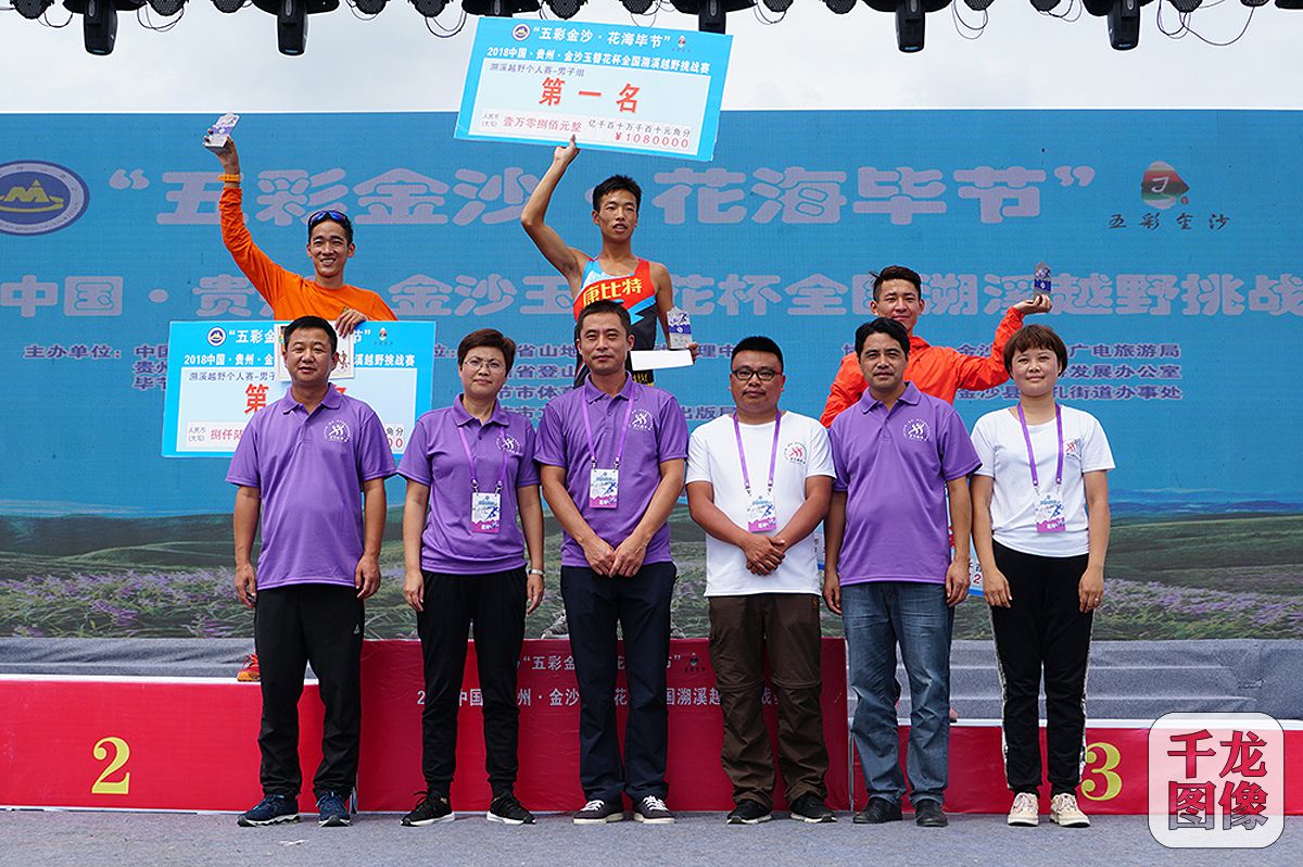 8月18日,“花海毕节·五彩金沙”2018中国·贵州·金沙玉簪花杯全国溯溪越野挑战赛鸣枪,来自全国16个省市的120余名精英选手参与42公里溯溪越野赛的角逐。图为领导和嘉宾为男子获奖选手颁奖。千龙网发 中国登山协会共图