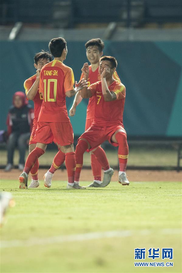 8月19日,中国队队员韦世豪(右一)在比赛中与队友庆祝进球。 当日,在第18届亚运会男子足球C组小组赛中,中国队以2比1战胜阿联酋队。 新华社记者吴壮摄