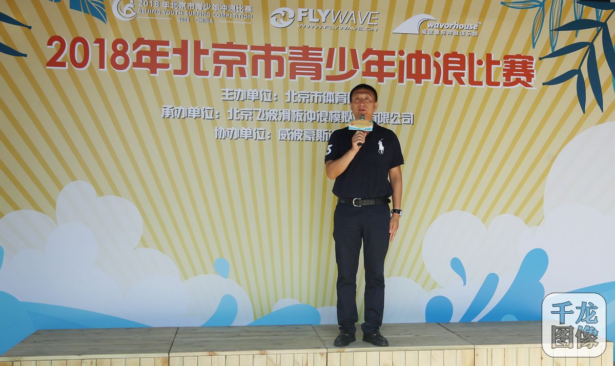 8月25日,2018年北京市青少年冲浪比赛在威波豪斯冲浪俱乐部开赛。这是北京市首次举办青少年冲浪赛事,60多名青少年报名参加比赛。图为北京市体育局青少处处长苏峻致辞。千龙网发 主办方供图