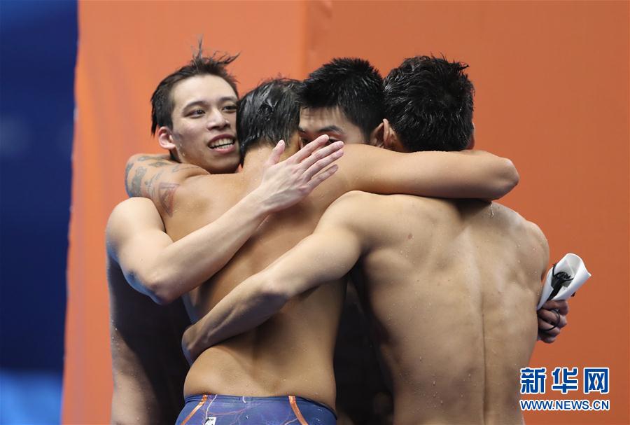 8月24日,中国队赛后庆祝。 当日,在第18届亚运会男子4X100米混合泳接力决赛中,中国队以3分29秒99的成绩夺冠。 新华社记者费茂华摄