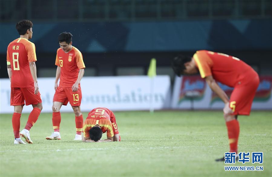 8月24日,中国队球员在比赛后。 当日,在第18届亚运会足球男子16进8的比赛中,中国以3比4不敌沙特队,无缘八强。 新华社记者兰红光摄