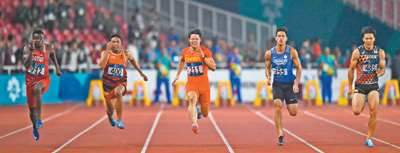 本报雅加达8月26日电(记者马剑)备受关注的亚运会男子百米飞人大战26日晚在雅加达朋加诺体育中心落下帷幕,中国队选手苏炳添以9秒92的成绩获得冠军并且打破了亚运会纪录。卡塔尔队选手托辛·奥古诺德和日本队选手山县亮太分获第二、第三名。