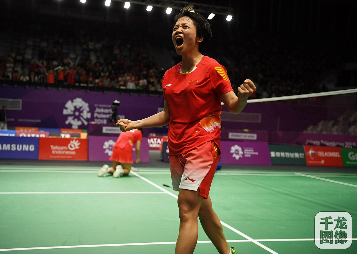 8月27日,中国运动员陈清晨(后)/贾一凡在比赛中。 当日,在第18届亚运会羽毛球女双决赛中,中国组合以2比0战胜日本组合获得冠军。千龙网发 萧峰摄
