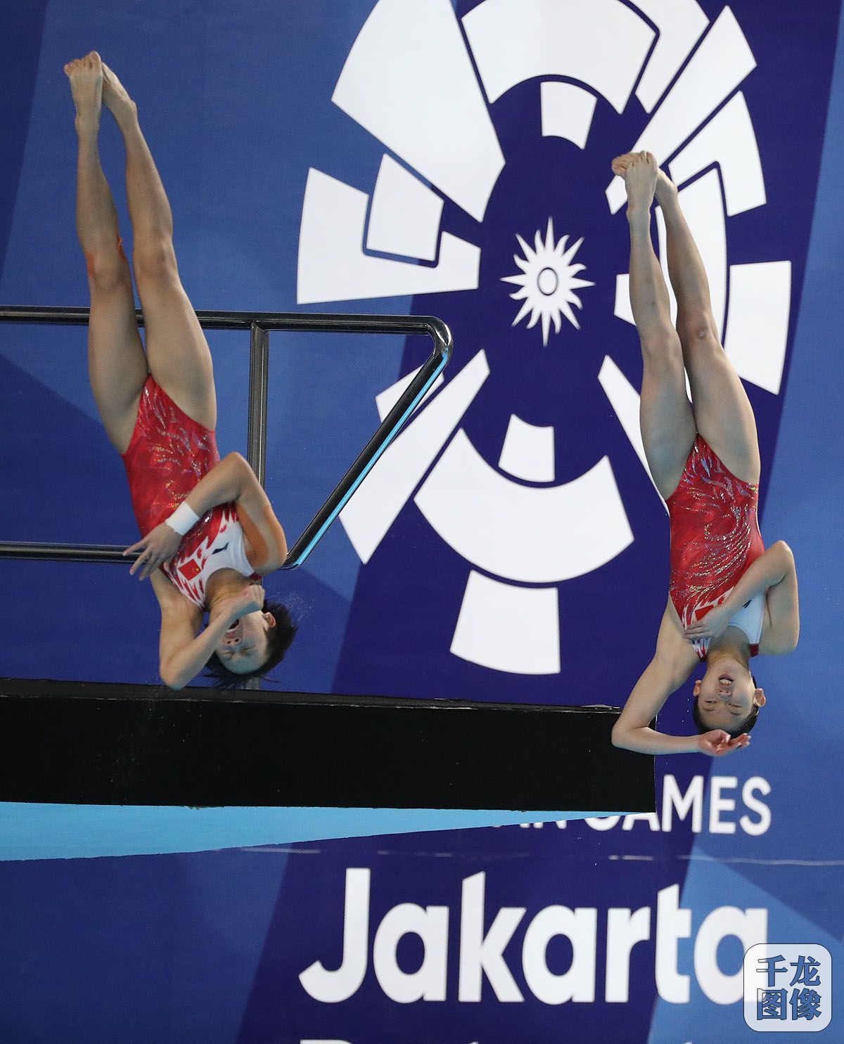8月28日,亚运会跳水比赛,掌敏洁搭档张家齐在女子双人10米台比赛中获得金牌。图为掌敏洁/张家齐在比赛中。千龙网发 萧峰摄