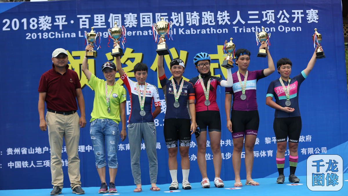 8月26日,2018黎平·百里侗寨国际划骑跑铁人三项公开赛在贵州黎平落幕,作为一项与常规铁人三项类似但又具有差别的全新赛事,2018年被授予了金牌赛事。图为颁奖仪式。千龙网发 主办方供图