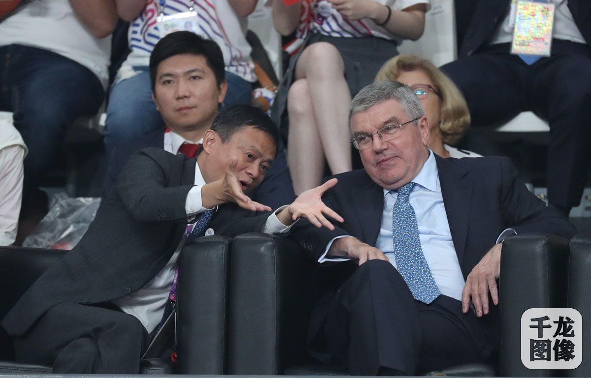 9月1日,雅加达亚运会女排决赛上演,中国女排直落三局轻松战胜泰国队获得冠军。图为巴赫(右)和马云观看比赛。千龙网发 萧峰摄