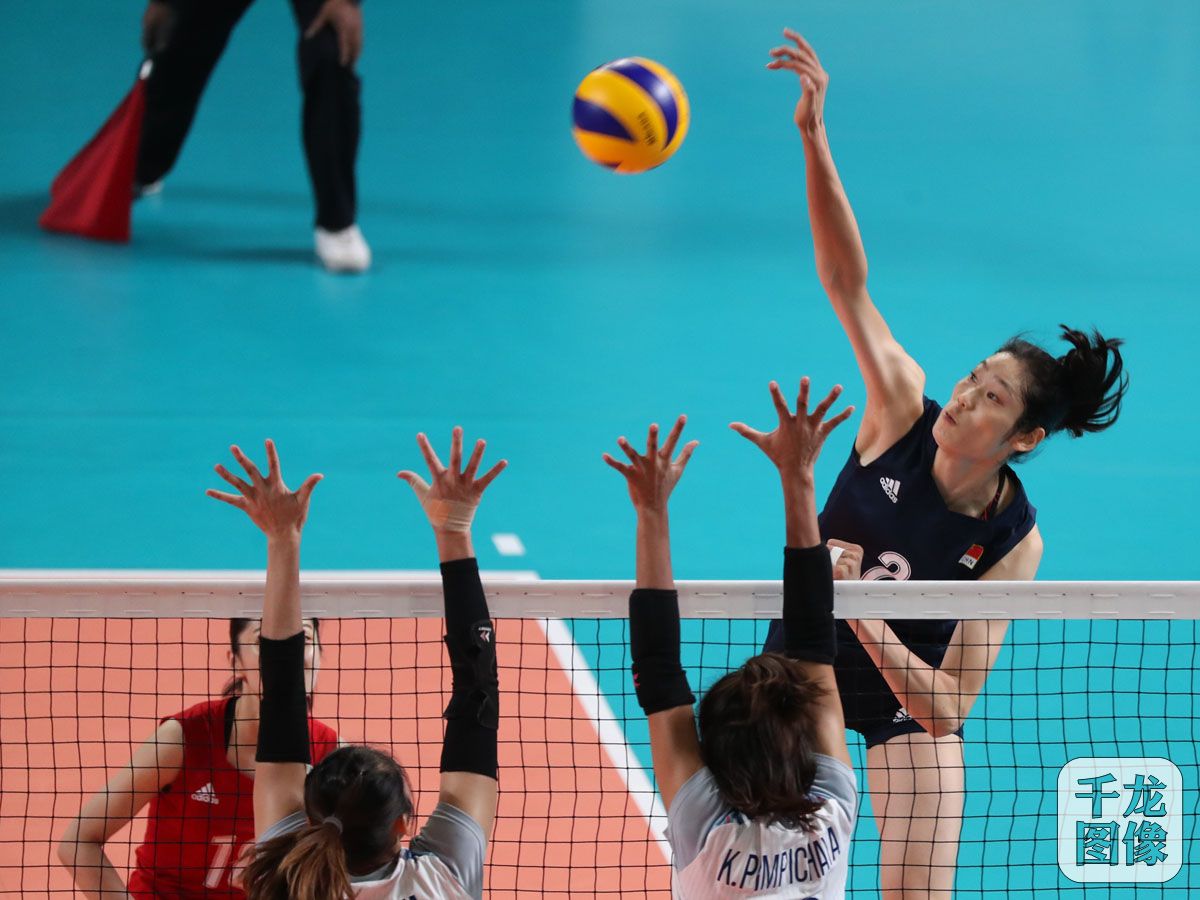 9月1日,雅加达亚运会女排决赛上演,中国女排直落三局轻松战胜泰国队获得冠军。图为本场比赛精彩瞬间。千龙网发 萧峰摄
