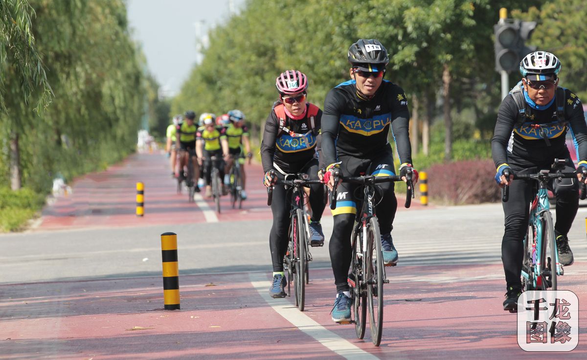 第十一届北京-北戴河公路自行车拉力赛9月8日在北京市通州区北关发枪,选手们经过近8个小时的长途骑行,最终李高明用时7小时20分、王国利用时7小时28分40秒、王艳春用时7小时46分48秒分获男子青年组、中年组和女子组冠军。图为全体队员在骑行中。千龙网发 崇惠友 张铁环 党伟光供图