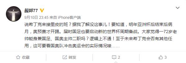 “说希丁克来接里皮的班?据我了解没这事儿!要知道,明年亚洲杯后结束后俩月,奥预赛才开踢。届时国足也要启动新的世界杯周期备战。大家觉得一72岁老帅能身兼国足、国奥主帅二职吗?逻辑上不通!至于未来希丁克会否有其他任用,这可要看国奥队冲击奥运会的实际情况喽……????”