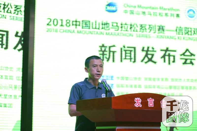 9月12日,2018中国山地马拉松系列赛——信阳鸡公山站新闻发布会在鸡公山万国文化演艺中心举行。图为中国登山协会新项目部赛事总监张耀华介绍中国山地马拉松系列赛事情况。千龙网发 主办方供图
