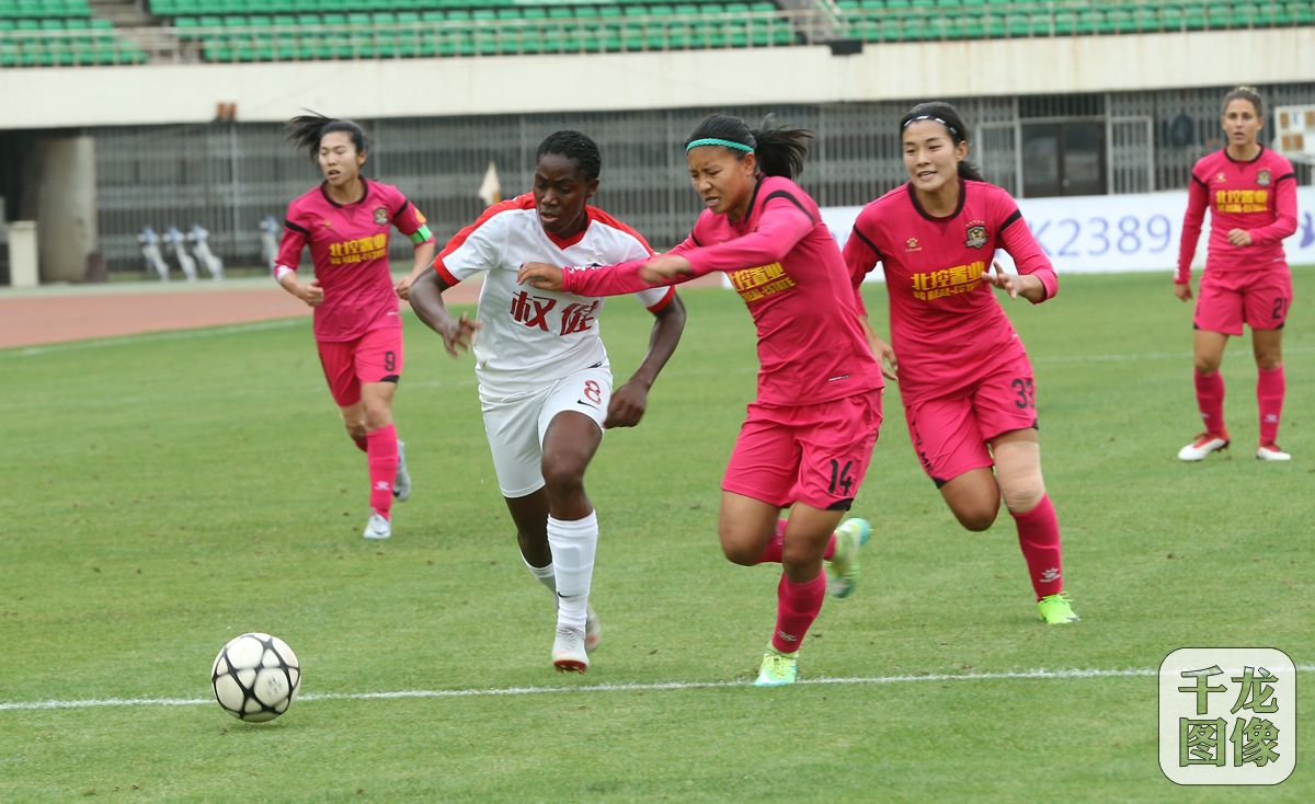 9月19日,2018中国足协杯赛半决赛首回合,北京北控置业女足主场迎战实力强劲的大连权健女足。上半时第4分钟,大连女足队员利用角球机会由12号李曏门前捡漏攻入一球;下半时第20分钟,21号维罗妮卡远射扳平比分,最终两队1:1握手言和。图为本场比赛精彩瞬间。千龙网记者 戚连民摄