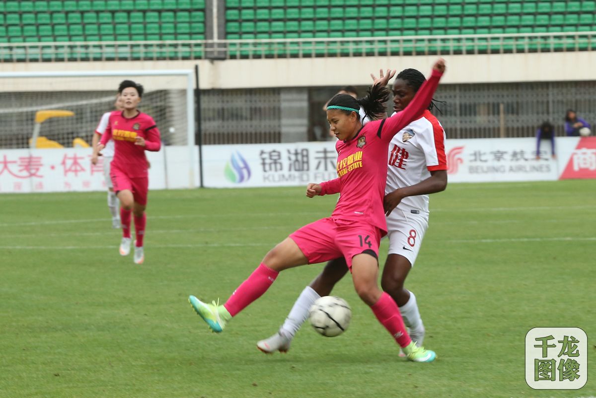 9月19日,2018中国足协杯赛半决赛首回合,北京北控置业女足主场迎战实力强劲的大连权健女足。上半时第4分钟,大连女足队员利用角球机会由12号李曏门前捡漏攻入一球;下半时第20分钟,21号维罗妮卡远射扳平比分,最终两队1:1握手言和。图为本场比赛精彩瞬间。千龙网记者 戚连民摄