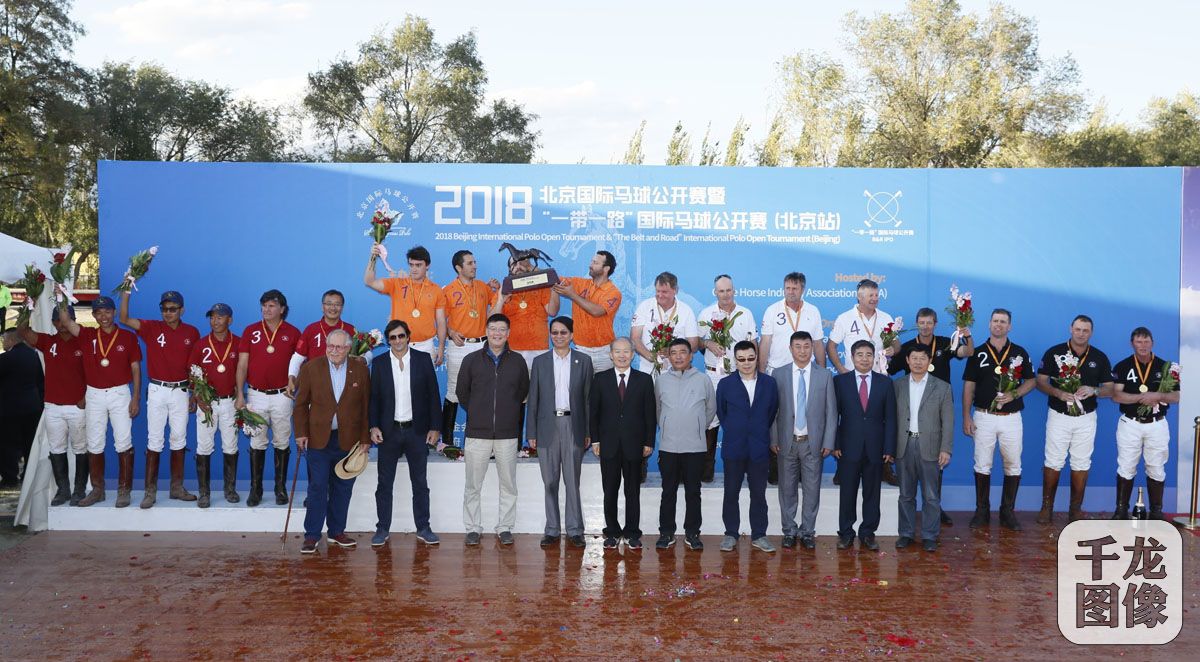 9月22日,2018北京国际马球公开赛总决赛在位于北京延庆康庄的北京阳光时代马球基地挥杆开赛。来自德国队、新西兰队、英国队与中国队的4支球队参加比赛。图为颁奖仪式。千龙网发 主办方供图