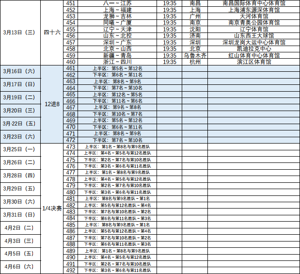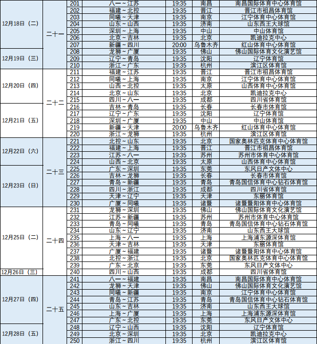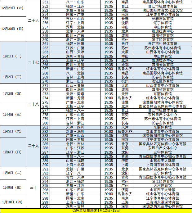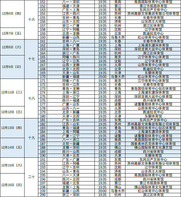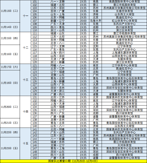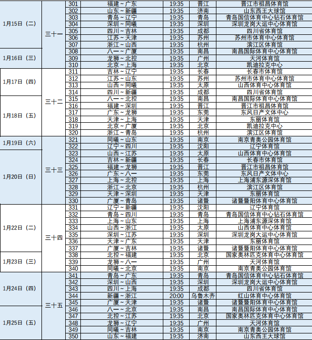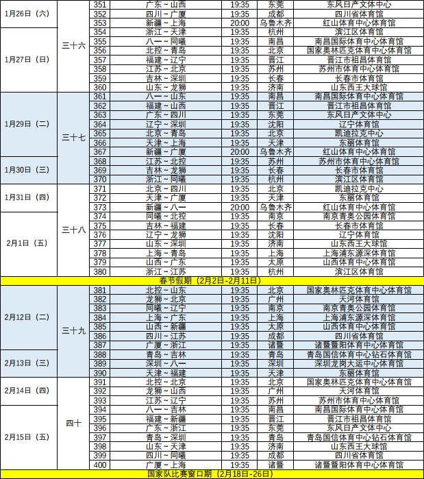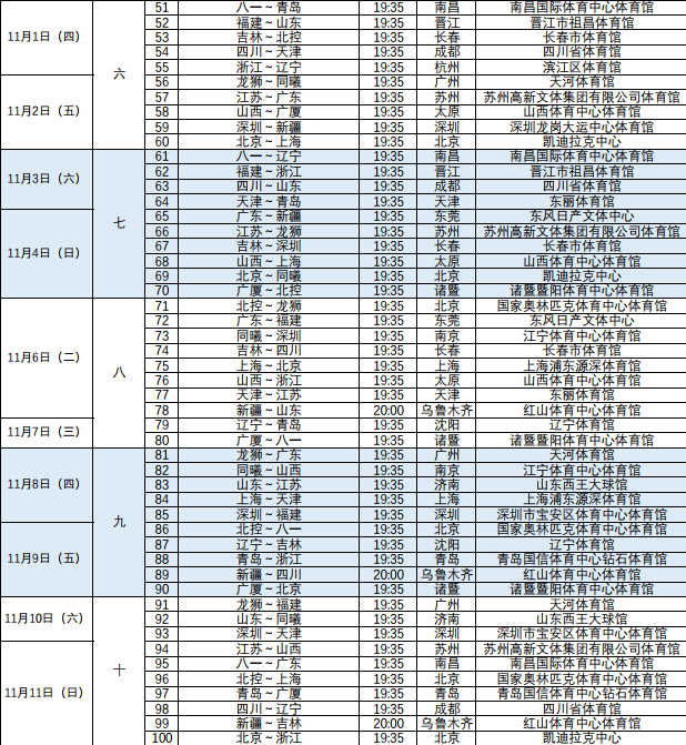 常规赛首轮比赛,卫冕冠军辽宁队将在主场迎战山东队,届时辽宁队将领取总冠军戒指。另外需要注意的是,这份新赛季赛程表是初定版本,之后还存在着调整的可能性。如无意外,官方版本将于明天发布。