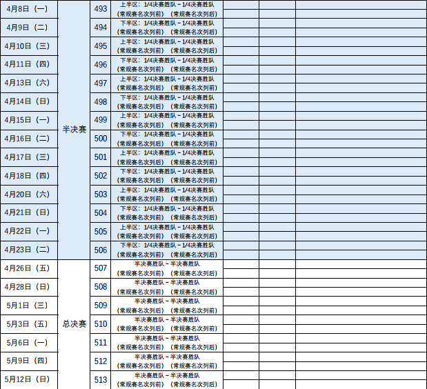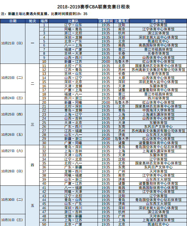 网曝,2018-2019赛季联赛竞赛日程表出炉,新赛季CBA联赛将于10月21日正式开打,季后赛则将于2019年3月16日开始进行,而总决赛则将在2019年4月26日开赛。