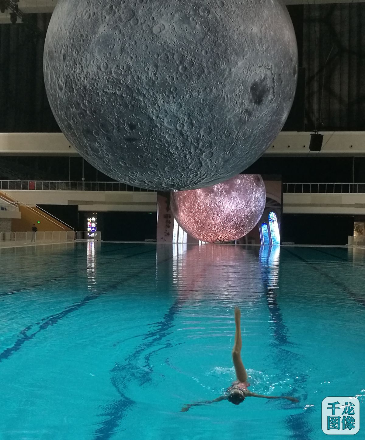 9月26日,艺术家卢克·杰拉姆在水立方文化沙龙活动上介绍创作“超级月亮”的初衷。图为月光下的花样游泳表演。千龙网记者 戚连民摄