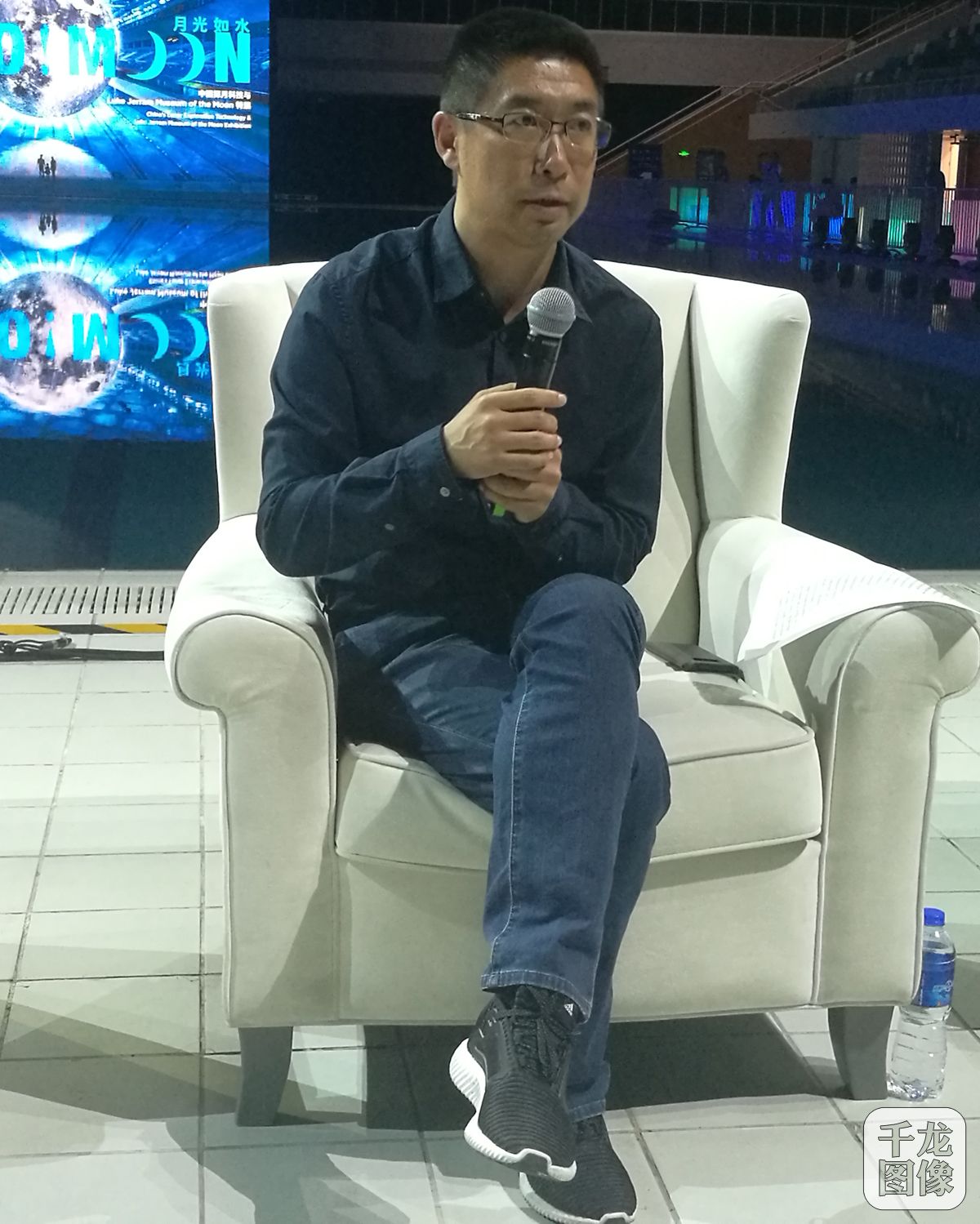 9月26日,艺术家卢克·杰拉姆在水立方文化沙龙活动上介绍创作“超级月亮”的初衷。图为国家游泳中心副总经理石海涛介绍水立方的赛后利用情况。千龙网记者 戚连民摄