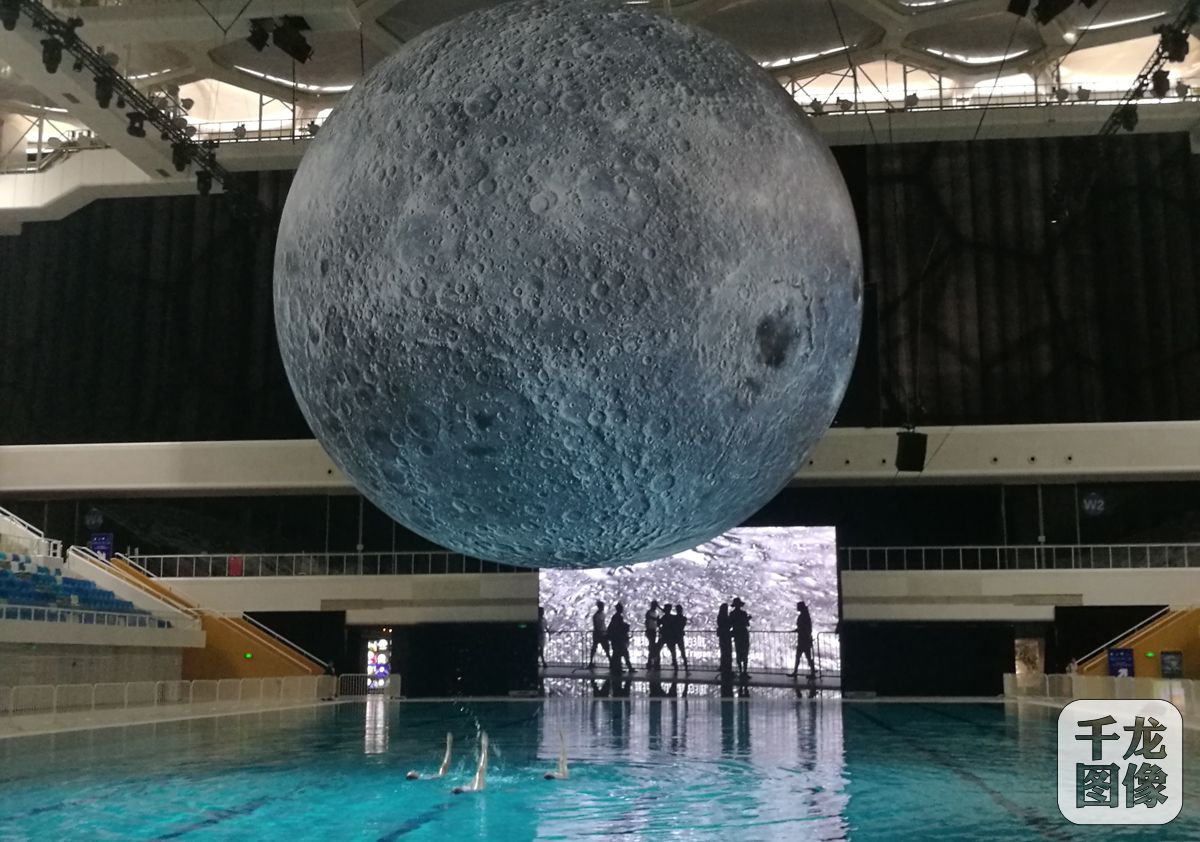 9月26日,艺术家卢克·杰拉姆在水立方文化沙龙活动上介绍创作“超级月亮”的初衷。图为月光下的花样游泳。千龙网记者 戚连民摄